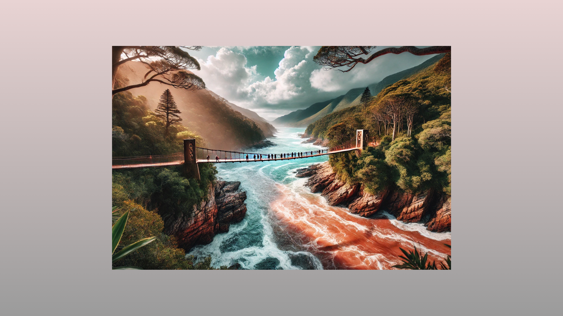 above the churning, red-brown waters of Storms River. The bridge, which hangs a